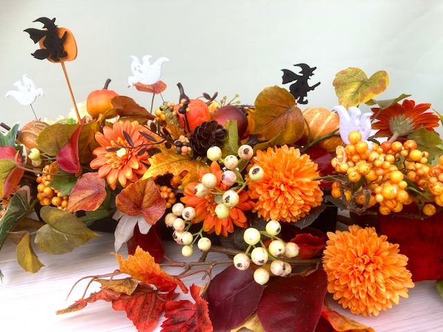 ただ、11月初めにはハロウィンの飾りを取ってしまうので、間が空いて寂しくならないように、バラバラの状態でお花を少しそのままお渡しします(これで安心ね💕)
