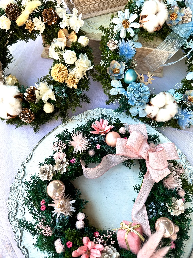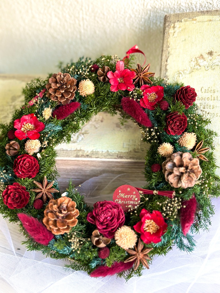 そこにプリザーブドフラワーのアジサイやカスミソウ、ドライフラワーの花達、そしてクリスマスにはなくてはならない「木の実」つまり松ぼっくりなどを、丁寧に配置して付けています☺️
