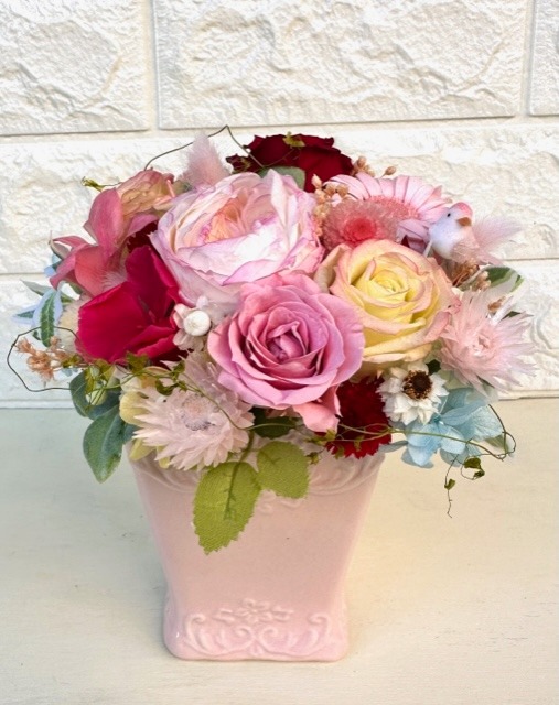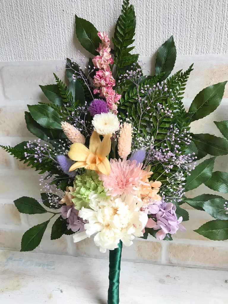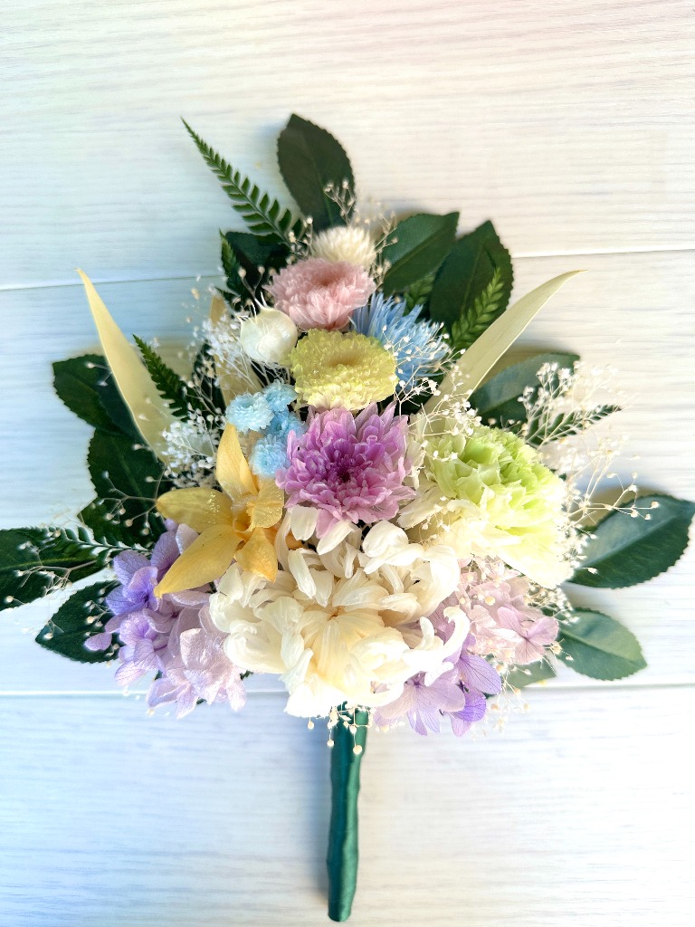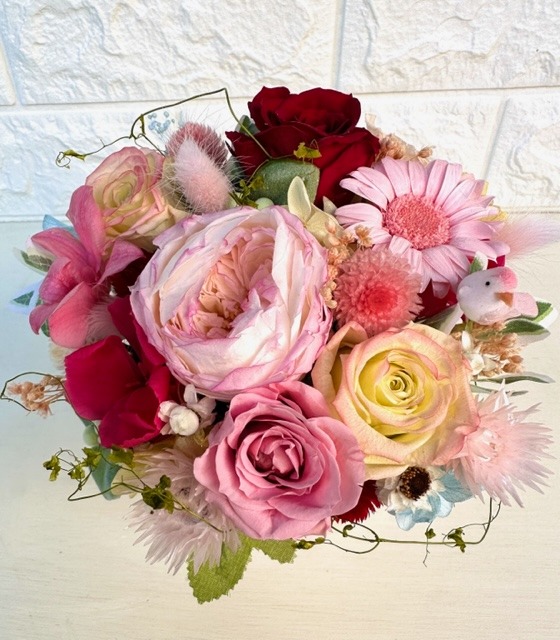 少しのドライフラワーや、少しだけアーティフィシャルフラワーを入れながら、違和感の無いように仕上げています。