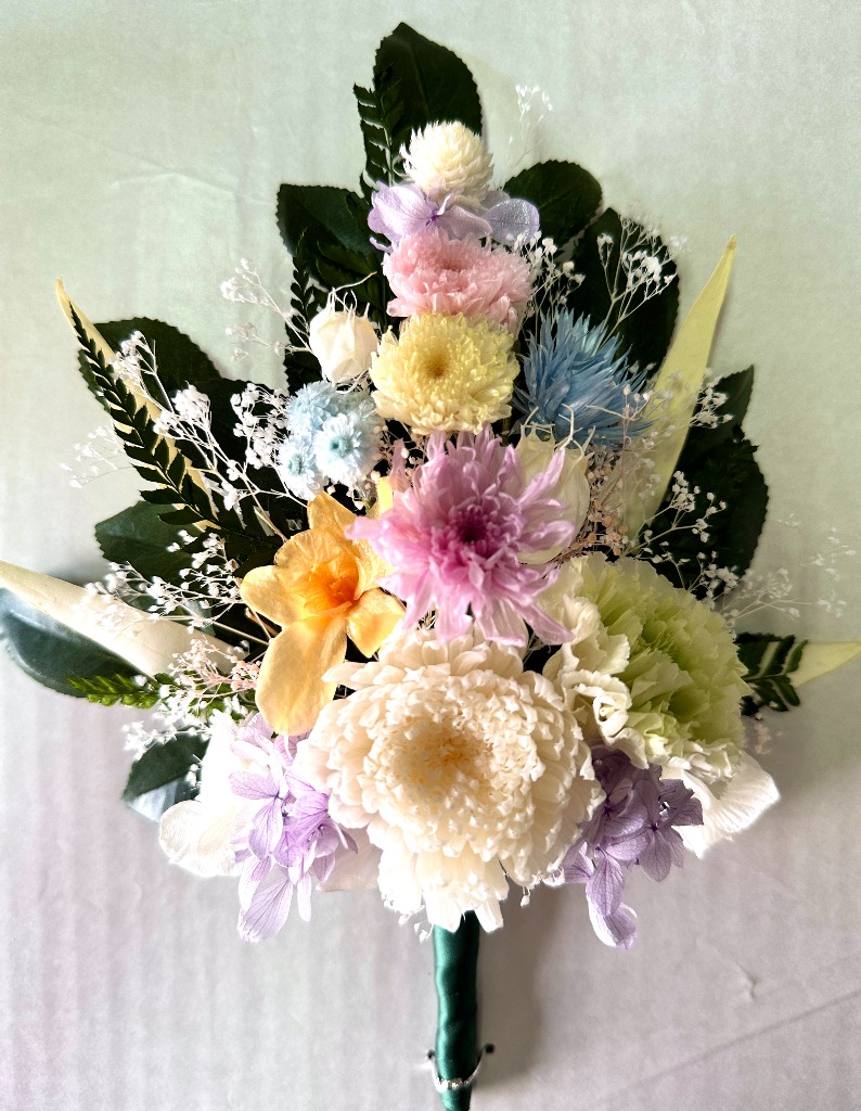 グリーンのみアーティフィシャルフラワーで、その他はシルバーデージーなどのドライフラワーもありますが、ほぼプリザーブドフラワーで作っています。